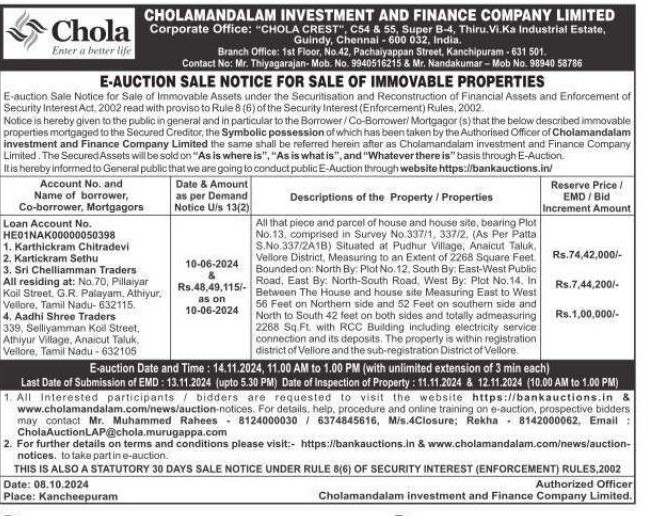 | Contact Details: | Contact The Authorized Officer Phno : Mr.Thiyagarajan: 9940516215,Mr.Nandakumar : 9894058786 |