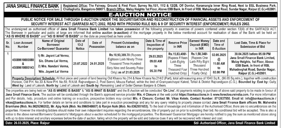 | Schedule of Property: | All that piece and parcel of land bearing Old Khasra No.214 & New Khasra No.214/2 (Part), total admeasuring area of 1040 Sq.ft., (96.65 Sq.mtrs.), together with construction thereon, Old P.H. No.33 & New P.H. No.59, R.N.M. Rajnandgaon-2, Post Somni, Mouza Farhad, within the limit of Grampanchayat Kakrel, Tehsil & District Rajnandgaon (C.G.). Bounded by: East by: Gully, West by: Land of Lakesh, North by: Land of Lakesh and South by: Remaining Land of Seller Deman Banjare & Others. |