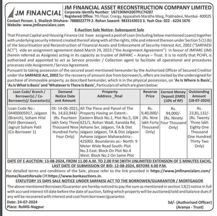 | Contact Details: | Contact The Authorized Officer: 1. Shailesh Shivhare- 7888022779 2. Rohan Sawant-9833143013 3. Yash Oza-022-6224 1676 Website- www.jmfinancialarc.com |