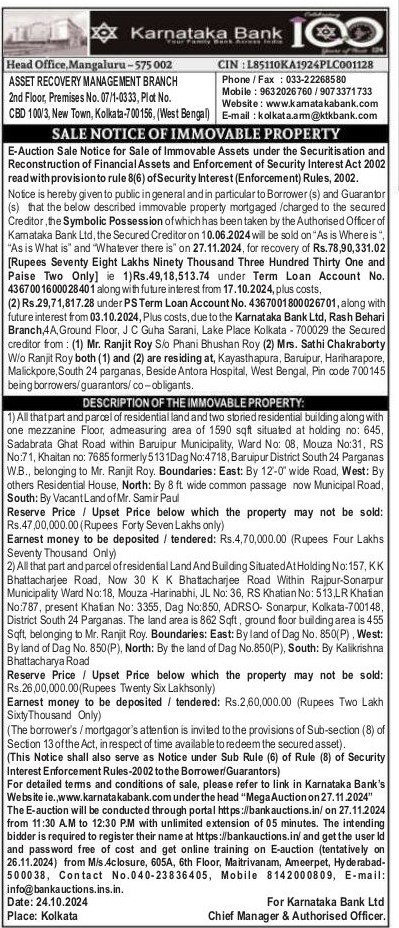 | End Date and Time of Auction: | 27-11-2024 12:30 pm |