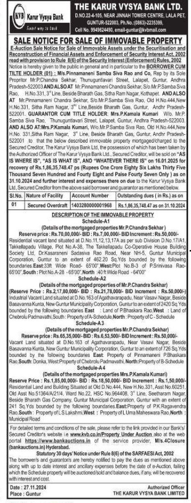 | Contact Details: | Contact The Authorized Officer : 08632235399, 9949624490, Email:guntur@kvbmail.com |