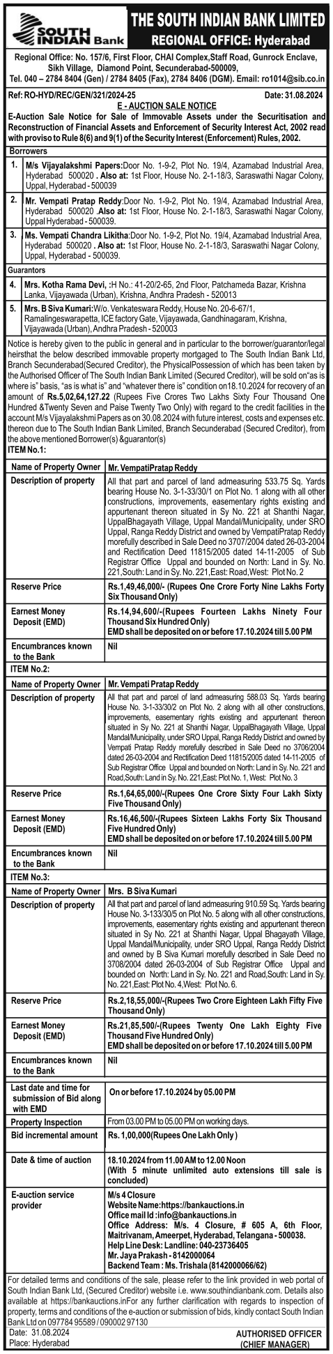 | Schedule of Property: | All that part and parcel of land admeasuring 910.59 Sq. Yards bearing House No. 3-133/30/5 on Plot No. 5 along with all other constructions, improvements, easementary rights existing and appurtenant thereon situated in Sy No. 221 at Shanthi Nagar, Uppal Bhagayath Village Uppal Mandal/Municipality, under SRO Uppal, Ranga Reddy District and owned by B Siva Kumari morefully described in Sale Deed no 3708/2004 dated 26-03-2004 of Sub Registrar Office Uppal and bounded on North: Land in Sy. No. 221 and Road, South: Land in Sy No. 221 East Plot No. 4. West: Plot No. 6 |