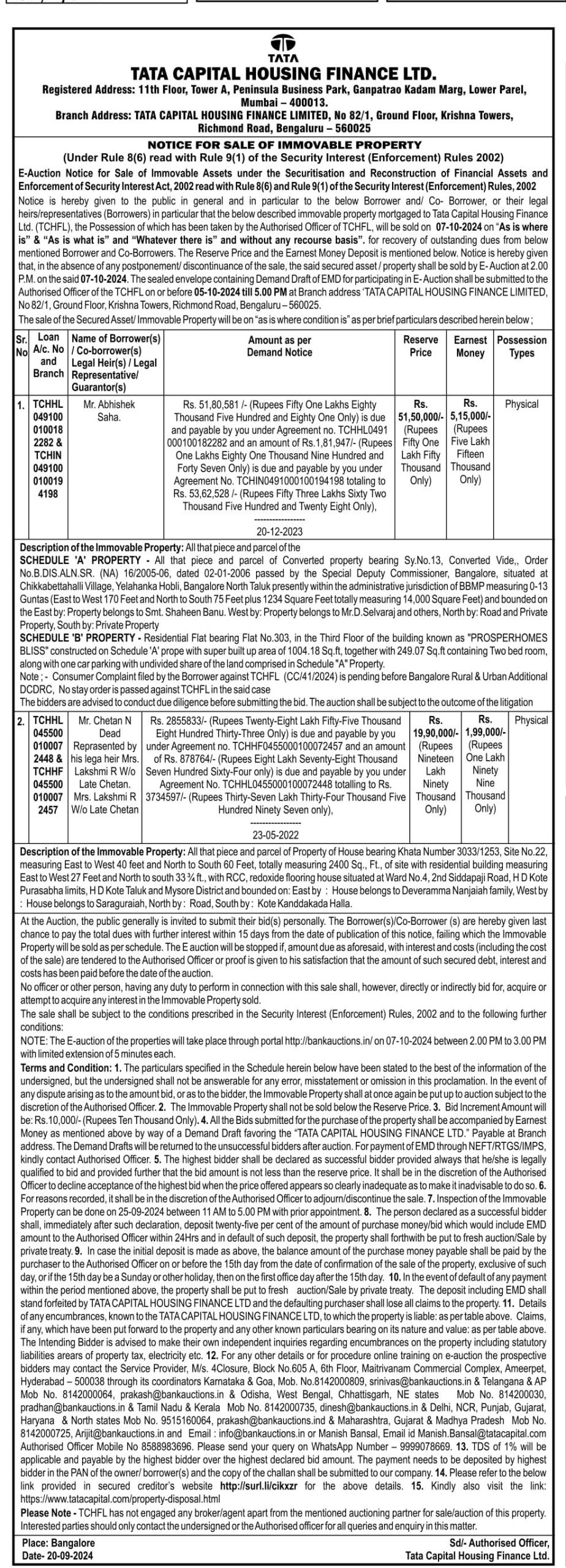 | Contact Details: | Contact The Authorized Officer : Manish Bansal, Email id Manish Bansal@tatacapital.com8588983696, 9999078669. |