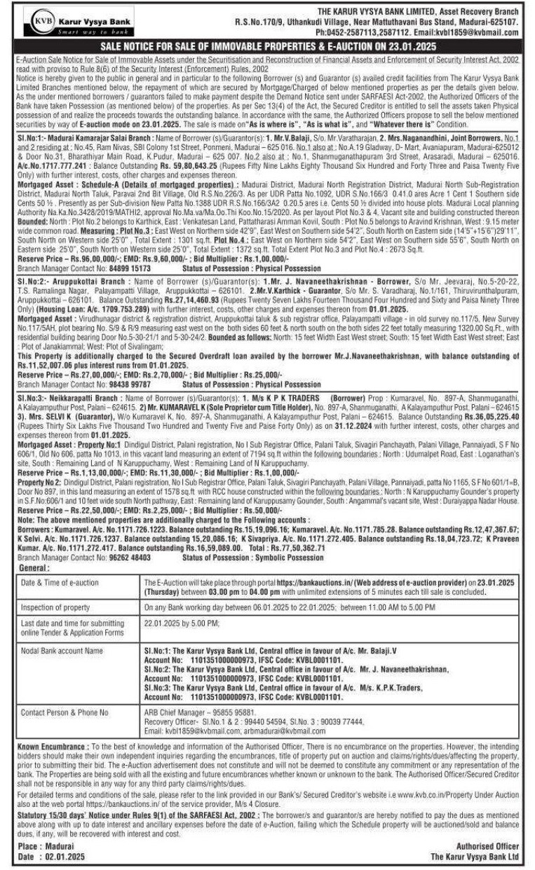 | Contact Details: | Contact The Authorized Officer : 95855-95881. Recovery officer: 90039-77444 Neikkarapatti Branch Manager: 96262-48403 Email: arbmadurai@kvbmail.com |