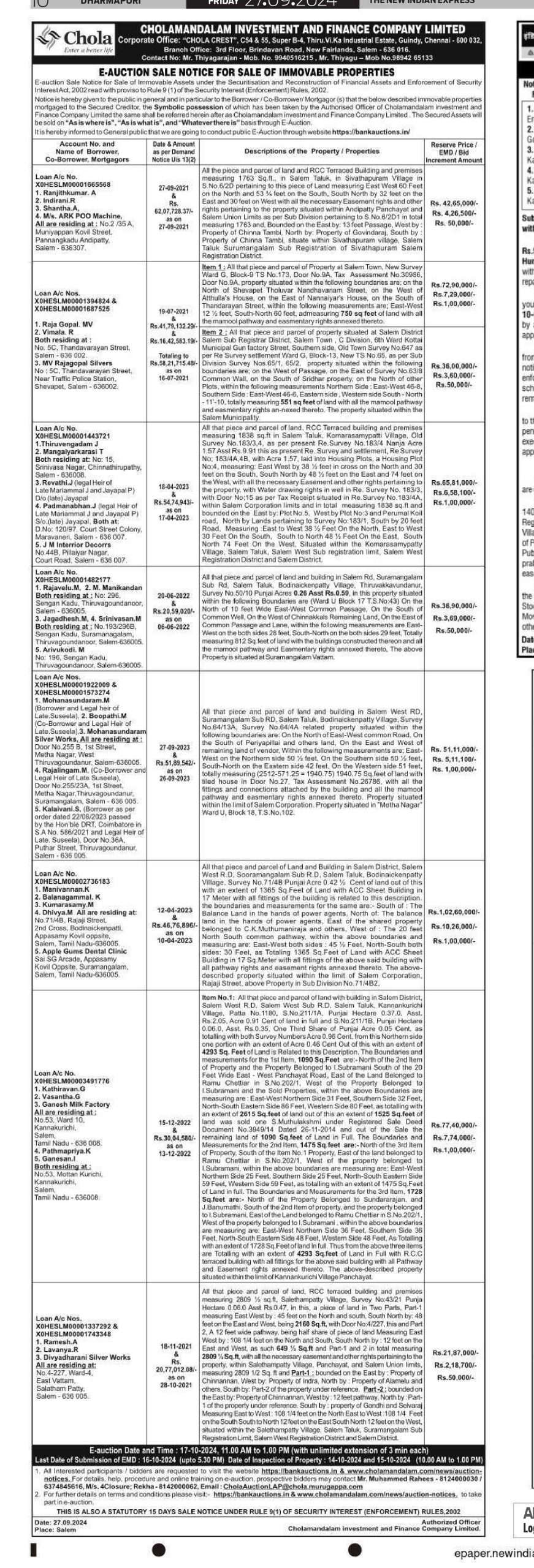 | Contact Details: | Contact The Authorized Officer Phno : Mr. Thiyagarajan Mob. No.9940516215, Mr. Muhammed Rahees 8124000030, Mr.Thiyagu: 9849265133 |