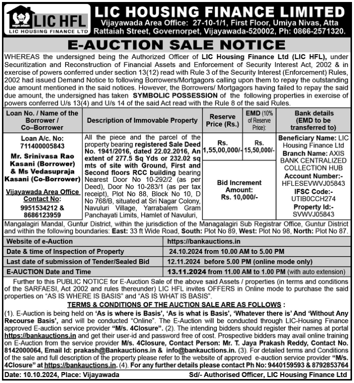 | End Date and Time of Auction: | 13-11-2024 1:00 pm |