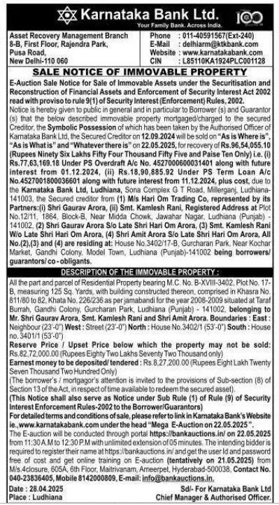 | Schedule of Property: | All the part and parcel of Residential Property bearing M.C. No. B-XVIII-3402, Plot No. 17-B, measuring 125 Sq. Yards, with building constructed thereon, comprised in Khasra No. 811/80 to 82, Khata No. 226/236 as per jamabandi for the year 2008-2009 situated at Taraf Burrah, Gandhi Colony, Gurcharan Park, Ludhiana (Punjab) 141002, belonging to Mr. Shri Gaurav Arora, Smt. Kamlesh Rani and Shri Amit Arora. Boundaries: East: Neighbour (23-0) West: Street (23-0) North House No.3402/1 (53-0') South: House no. 3401/1 (53-0) |