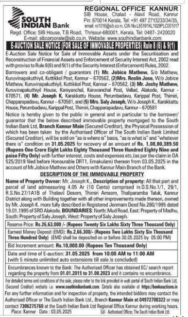 | Schedule of Property: | Name of Property Owner: Mr. Joseph K., Description of property: All that part and parcel of land admeasuring 4.05 Ar (10 Cents) comprised in.O.S.No.1/1, 29/1, R.S.No.27/1A1B of Thalavil Desom, Thimiri Amsom, Thaliparamba Taluk Kannur District along with Building together with all other improvements made thereon, owned by Mr. Joseph K. more fully described in Registered Jenmam Deed No 260/1995 dated 19.01.1995 of SRO Alakode. BOUNDARIES: North: Mud Road, East: Property of Madhu, South: Property of Saly Joseph West: Property of Saly Joseph |