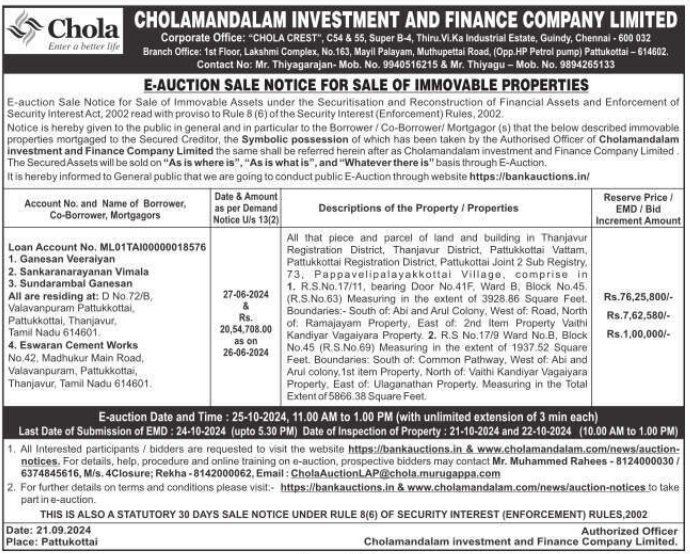 | Contact Details: | Contact The Authorized Officer : Mr. Thiyagarajan- Mob. No. 9940516215 & Mr. Thiyagu - 9894265133, Mr. Muhammed Rahees - 8124000030 |