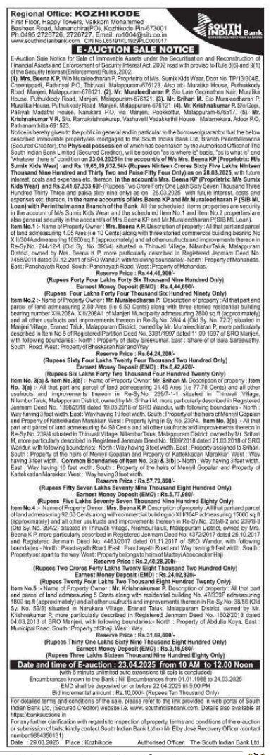 | Schedule of Property: | Item No. 3(a) & Item No.3(b): Name of Property Owner: Mr. Srihari M. Description of property: Item No. 3(a): All that part and parcel of land admeasuring 31.45 Ares (Le 77.70 Cents) and all other usufructs and improvements thereon in Re-Sy No. 239/7-1-1 situated in Thiruvali Village, Nilambur Taluk, Malappuram District, owned by Mr. Srihari M, more particularly described in Registered Janmam Deed No. 1390/2018 dated 19.03.2018 of SRO Wandur, with following boundaries: North Way having 3 feet width. East: Way having 10 feet width. South: Property of the heirs of Meniyil Gopalan and Property of Katteikadan Marakkar, West: Property lying in Sy No. 2394. Item No. 3(b): All that part and parcel of land admeasuring 84.98 Cents and all other usufructs and improvements thereon in Re-Sy.No. 239/4 situated in Thiruvali Village, Nilambur Taluk, Malappuram District, owned by Mr. Srihari M, more particularly described in Registered Jenmam Deed No. 1609/2018 dated 21.03.2018 of SRO Wandur, with following boundaries:-North Way having 3 feet width. East Property assigned to Srihari. South: Property of the heirs of Meniyll Gopalan and Property of Kattekkadan Marakkar. West Way having 3 feet width. Common Boundaries of Item No. 3(a) & 3(b):-North Way having 3 feet width. East: Way having 10 feet width. South Property of the heirs of Meniyil Gopalan and Property of Kattekkadan Marakkar West: Way having 3 feet width |