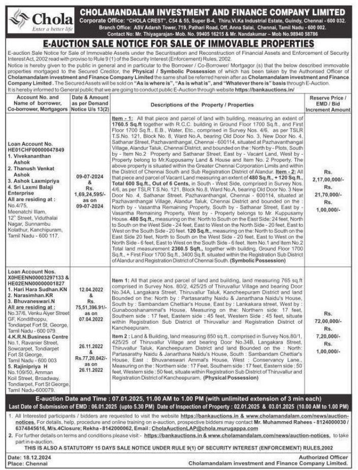 | Contact Details: | Contact the Authorized Officer : Mr. Muhammed Rahees - 8124000030 / 6374845616, Mr. Thiyagarajan- Mob. No. 9940516215 & Mr. Nandakumar - Mob No.9894058786. |