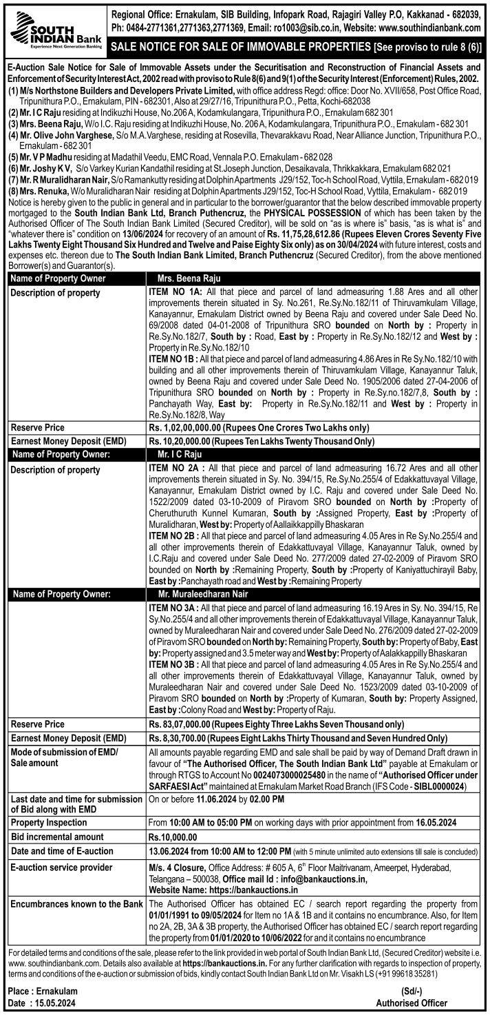 | Schedule of Property: | ITEM NO 1A: All that piece and parcel of land admeasuring 1.88 Ares and all other improvements therein situated in Sy. No.261, Re.Sy.No.182/11 of Thiruvamkulam Village, Kanayannur, Ernakulam District owned by Beena Raju and covered under Sale Deed No. 69/2008 dated 04-01-2008 of Tripunithura SRO bounded on North by : Property in Re.Sy.No.18 South by : Road, East by : Property in Re.Sy.No.182/12 and West by : Property in Re.Sy.No.182/10ITEM NO 1B : All that piece and parcel of land admeasuring 4.86 Ares in Re No. 182/10 with building and all other improvements therein of Thiruvamkulam Village, Kanayannur Taluk, owned by Beena Raju and covered under Sale Deed No. 1905/2006 dated 27-04-2006 of Tripunithura SRO bounded on North by : Property in Re.Sy.no.182/7,8, South by : Panchayath Way, East by: Property in Re.Sy.No.182/11 and West by : Property in Re.Sy.No.182/ 8Way |