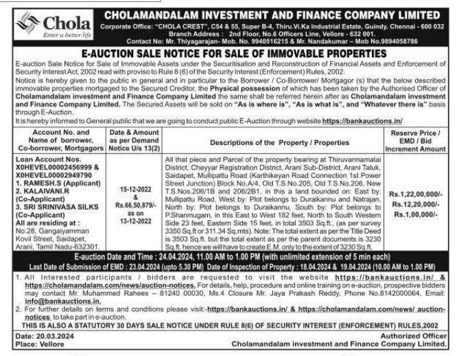 | Contact Details: | Contact The Authorized Officer: Mr. Thiyagarajan - 9940516215 & Mr. Nandakumar - 9894058786, Mr. Muhammed Rahees - 8124000030 |