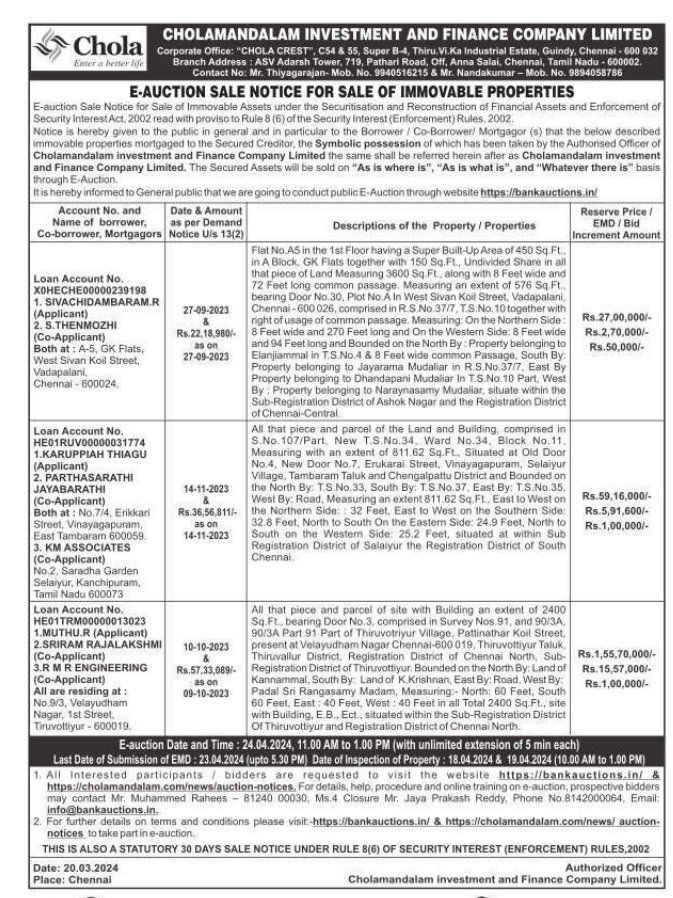 | Contact Details: | Contact The Authorized Officer: Mr. Thiyagarajan - 9940516215 & Mr. Nandakumar - 9894058786, Mr. Muhammed Rahees - 8124000030 |
