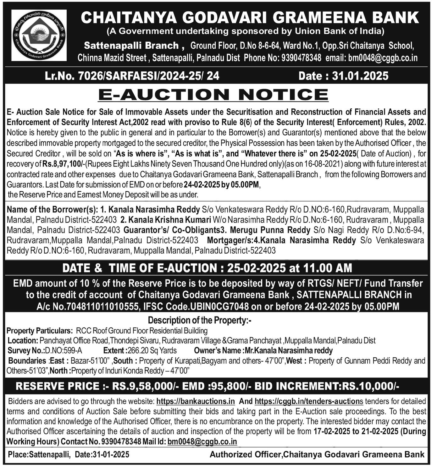 | Start Date and Time of Auction: | 25-02-2025 11:00 am |