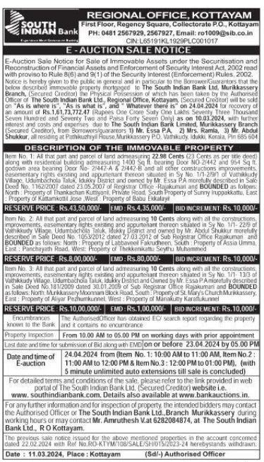 | Schedule of Property: | Item No. 1: All that part and parcel of land admeasuring 22.98 Cents (23 Cents as per title deed) along with residential building admeasuring 1400 Sq ft. bearing Door NO-2/442 and 954 Sq ft. godown area bearing Door No- 2/442-A & 2/442-8 and all other constructions improvements, easementary rights existing and appurtenant thereon situated in Sy No. 1/1-2/9/1 of Vathikkudy Vilage. Udumbachola Taluk, Idukky District and owned by Mr. Essa PA morefully described in Sale Deed No. 1162/2007 dated 23.05.2007 of Registrar Office -Rajakuman and BOUNDED as follows: North Property Property o of Thankachan Kuttiyani, Private Road, South Property Sunny Iruppakkattu, East Property of of Kattamkottil Jose West Property of Babu Ekkalay |