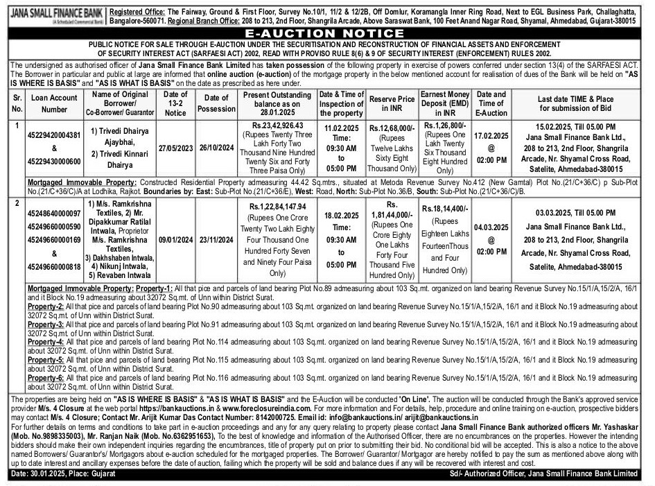 | Schedule of Property: | Property-1: All that piece and parcels of land bearing Plot No.89 admeasuring about 103 Sq.mt. organized on land bearing Revenue Survey No. 15/1/A, 15/2/A, 16/1 and it Block No.19 admeasuring about 32072 Sq.mt. of Unn within District Surat. Property-2: All that pice and parcels of land bearing Plot No.90 admeasuring about 103 Sq.mt. organized on land bearing Revenue Survey No. 15/1/A, 15/2/A, 16/1 and it Block No.19 admeasuring about 32072 Sq.mt. of Unn within District SuratProperty-3: All that pice and parcels of land bearing Plot No.91 admeasuring about 103 Sq.mt. organized on land bearing Revenue Survey No. 15/1/A, 15/2/A, 16/1 and it Block No.19 admeasuring about 32072 Sq.mt. of Unn within District Surat.Property-4: All that pice and parcels of land bearing Plot No.114 admeasuring about 103 Sq.mt. organized on land bearing Revenue Survey No. 15/1/A,15/2/A, 16/1 and it Block No.19 admeasuring about 32072 Sq.mt. of Unn within District Surat.Property-5: All that pice and parcels of land bearing Plot No.115 admeasuring about 103 Sq.mt. organized on land bearing Revenue Survey No. 15/1/A,15/2/A, 16/1 and it Block No.19 admeasuring about 32072 Sq.mt. of Unn within District SuratProperty-6: All that pice and parcels of land bearing Plot No.116 admeasuring about 103 Sq.mt. organized on land bearing Revenue Survey No. 15/1/A,15/2/A, 16/1 and it Block No.19 admeasuring about 32072 Sq.mt. of Unn within District Surat. |