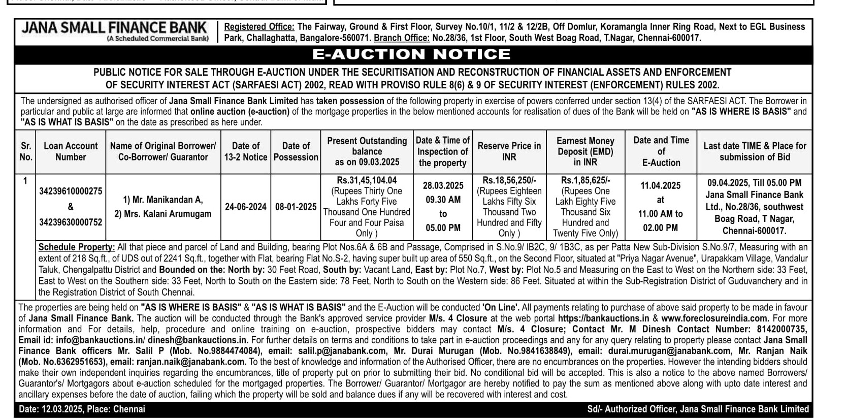 | Contact Details: | Contact the Authorized officer : Mr Durai Murugan 9841638849, Mr. ranjan naik 6362951653,Mr. Salil P 9884474084 |
