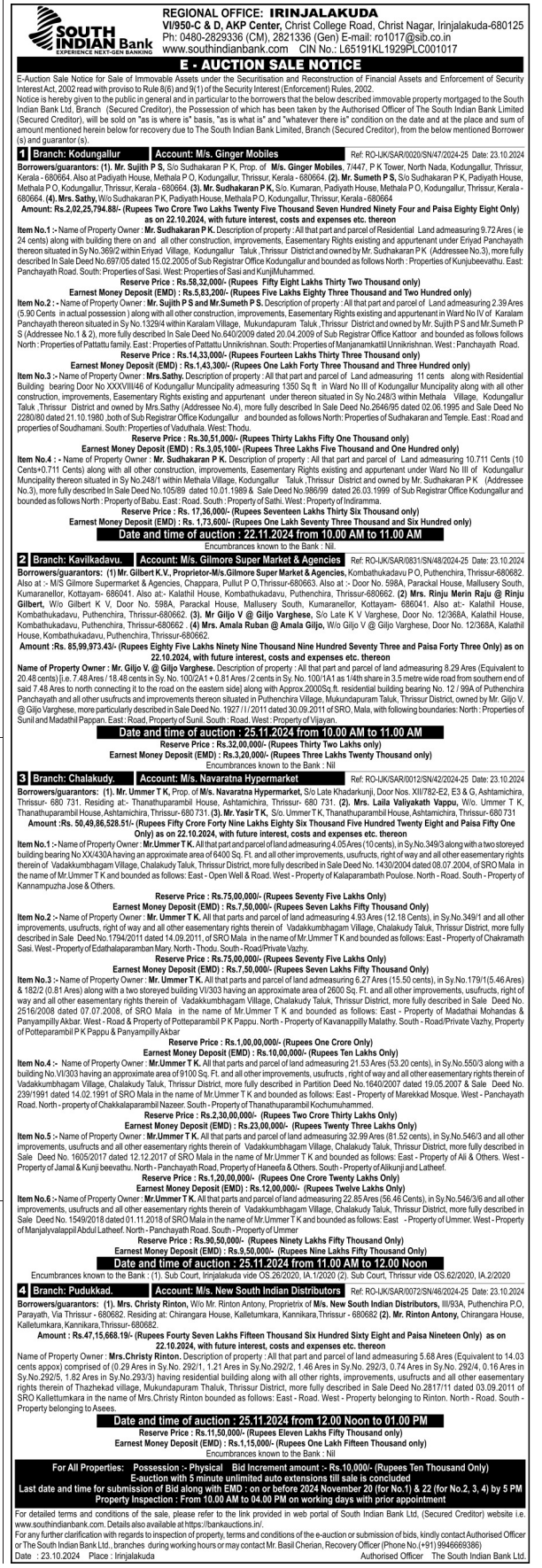 | Schedule of Property: | Item No.2:- Name of Property Owner: Mr. Ummer TK. All that parts and parcel of land admeasuring 4.93 Ares (12.18 Cents), in Sy.No.349/1 and all other improvements, usufructs, right of way and all other easementary rights therein of Vadakkumbhagam Village, Chalakudy Taluk, Thrissur District, more fully described in Sale Deed No. 1794/2011 dated 14.09.2011, of SRO Mala in the name of Mr. Ummer TK and bounded as follows: East-Property of Chakramath Sasi. West-Property of Edathalaparamban Mary. North-Thodu. South-Road/Private Vazhy. |
