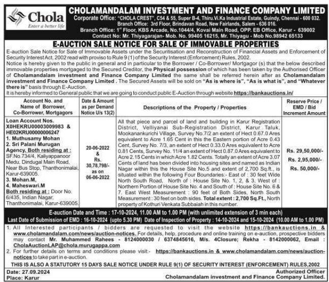 | Contact Details: | Contact The Authorized Officer : Mr. Thiyagarajan- Mob. No. 9940516215, Mr. Thiyagu Mob No.9894265133 |