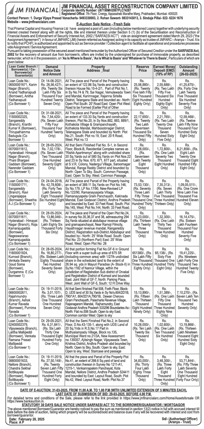 | Contact Details: | Contact The Authorized Officer: 1. Durga Vijaya Prasad Vanacharla-9493330003, 2. Rohan Sawant-9833143013, 3. Sinduja Pillai-022-6224 1676 Website-www.jmfinancialarc.com |