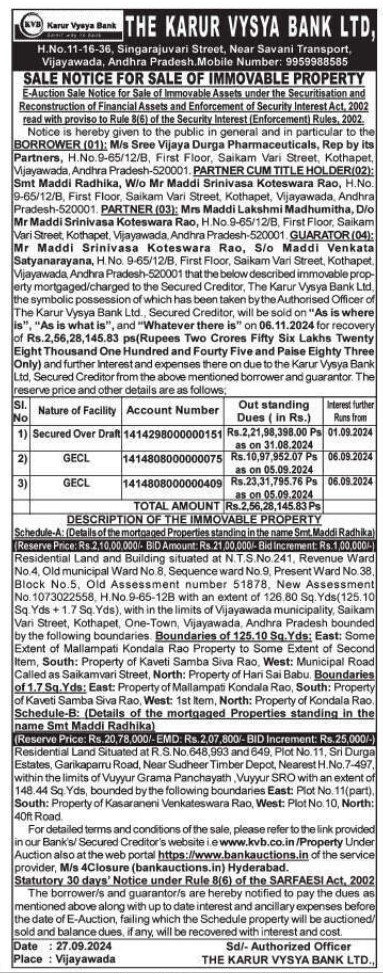 | Schedule of Property: | Residential Land and Building situated at N.T.S.No. 241, Revenue Ward No.4, Old municipal Ward No. 8, Sequence ward No.9, Present Ward No.38, Block No.5, Old Assessment number 51878, New Assessment No. 1073022558, H.No.9-65-128 with an extent of 126.80 Sq. Yds(125.10 Sq. Yds +1.7 Sq. Yds), with in the limits of Vijayawada municipality, Saikam Vari Street, Kothapet, One-Town, Vijayawada, Andhra Pradesh bounded by the following boundaries. Boundaries of 125.10 Sq. Yds: East: Some Extent of Mallampati Kondala Rao Property to Some Extent of Second Item, South: Property of Kaveti Samba Siva Rao, West: Municipal Road Called as Saikamvari Street, North: Property of Hari Sai Babu. Boundaries of 1.7 Sq. Yds: East: Property of Mallampati Kondala Rao, South: Property of Kaveti Samba Siva Rao, West: 1st Item, North: Property of Kondala Rao. Schedule-B: (Details of the mortgaged Properties standing in the name Smt Maddi Radhika) |
