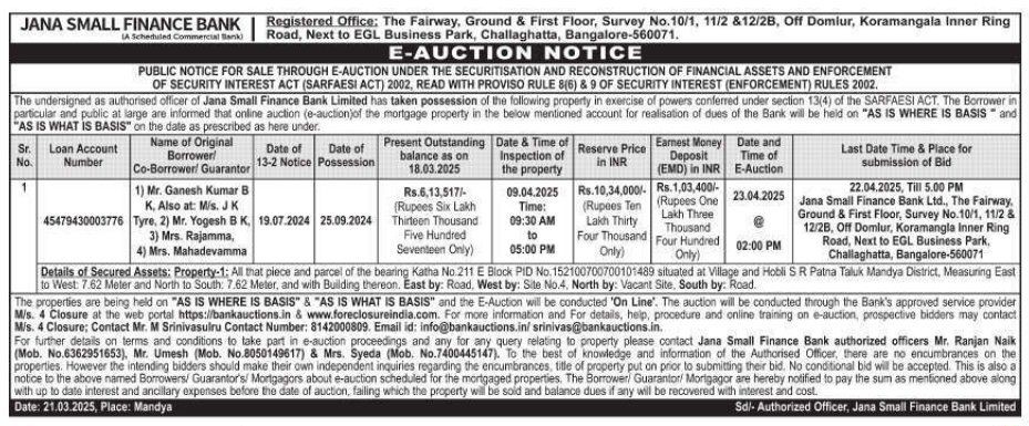 | Contact Details: | Contact The Authorized Officer: Mr. Ranjan Naik (Mob. No.6362951653), Mr. Umesh (Mob. No.8050149617) & Mrs. Syeda (Mob. No.7400445147) |