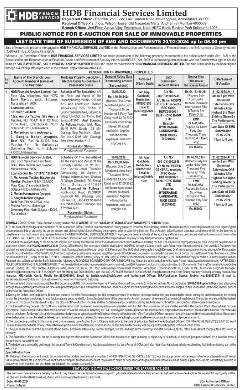 | Contact Details: | Contact The Authorized Officer: Mr. Ajay Galphade Ph No: 8788551655, Mr. Harish Kachi Ph No: 8830938191, Mr. Vijaykumar Sapkal Ph No: 8888873781 |
