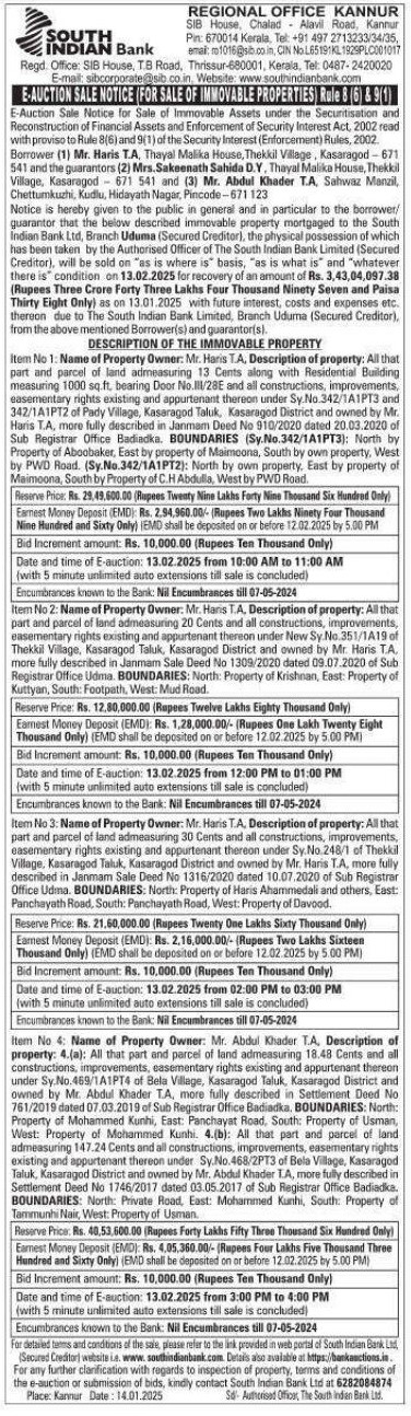 | Schedule of Property: | Item No 4: Name of Property Owner: Mr. Abdul Khader T.A. Description of property: 4.(a): All that part and parcel of land admeasuring 18.48 Cents and all constructions improvements easementary rights existing and appurtenant thereon under Sy. o.469/1A1PT4 of Bela Village, Kasaragod Taluk Kasaragod District and owned by Mr. Abdul Khader T.A. more fully described in Settlement Deed No 761/2019 dated 07.03.2019 of Sub Registrar Office Badiadka. BOUNDARIES: North: Property of Mohammed Kunhi, East: Panchayat Road, South: Property of Usman, West: Property of Mohammed Kunhi. 4.(b): All that part and parcel of land admeasuring 147.24 Cents and all constructions improvements, easementary rights existing and appurtenant thereon under .468/2PT3 of Bela Village, Kasaragod Taluk, Kasaragod District and owned by Mr. Abdul Khader LA, more fully described in Settlement Deed No 1746/2017 dated 03.05.2017 of Sub Registrar Office Badiadka. BOUNDARIES: North: Private Road East Mohammed Kunhi, South: Property of Tammunhi Nair, West: Property of Usman |