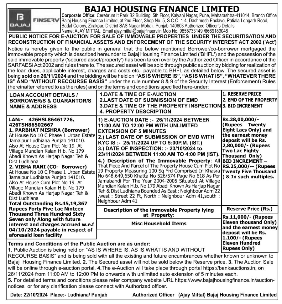 | Contact Details: | Contact the Authorized Officer : AJAY MITTAL, Email: ajay.mittal@bajajfinserv.in,Mob No. 9855733149 / 8669189048. |