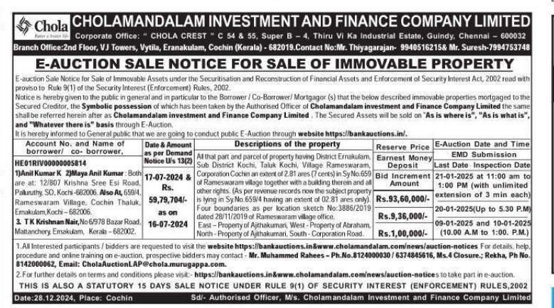 | Contact Details: | Contact The Authorized Officer : Mr. Thiyagarajan 9940516215, Mr. Suresh 7994753748, Mr. Muhammed Rahees 8124000030, 6374845616 |