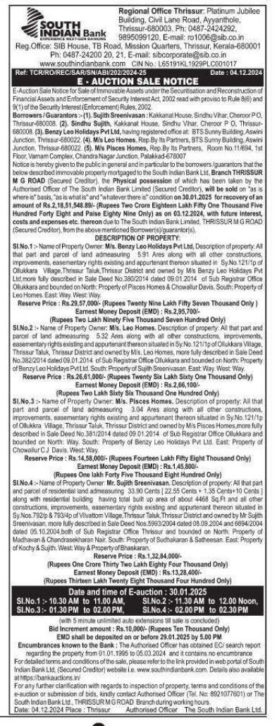 | Inspection Details: | Property Inspection Contact The Authorized Officer: 8921077601, 0487-24200 E-mail: sibcorporate@sib.co.in |