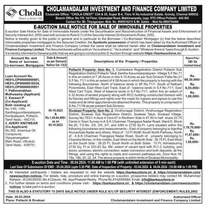 | Contact Details: | Contact The Authorized Officer: Mr. Thiyagarajan - 9940516215 & Mr. Satish - 9894704400, Mr. Muhammed Rahees - 8124000030 |