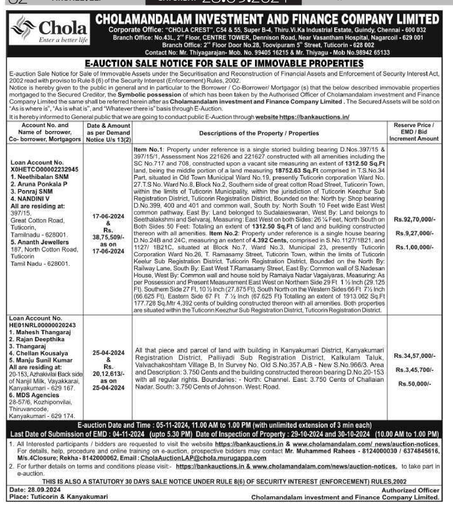| Contact Details: | Contact The Authorized Officer : Mr. Thiyagarajan- Mob. No. 99405 16215 & Mr. Thiyagu T Mob No.98942 65133, Mr. Muhammed Rahees - 8124000030 |