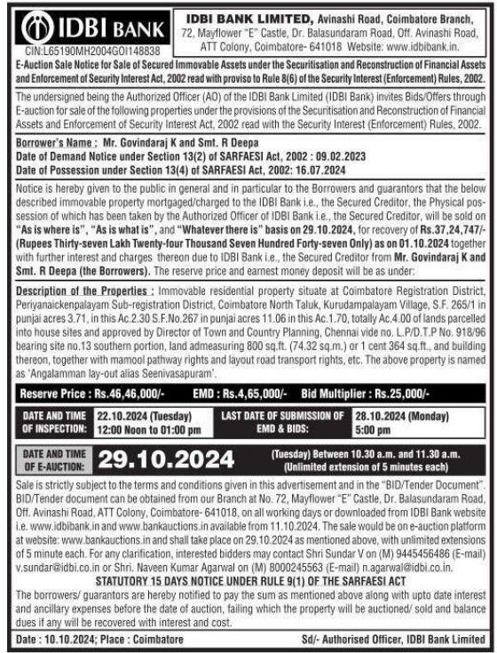 | End Date and Time of Auction: | 29-10-2024 11:30 am |