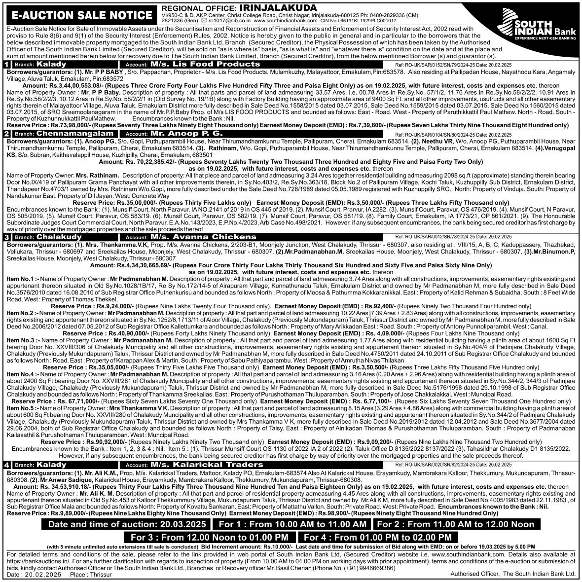 | Contact Details: | Contact The Authorized Officer : Mr Basil Cherian : 9946669386 |