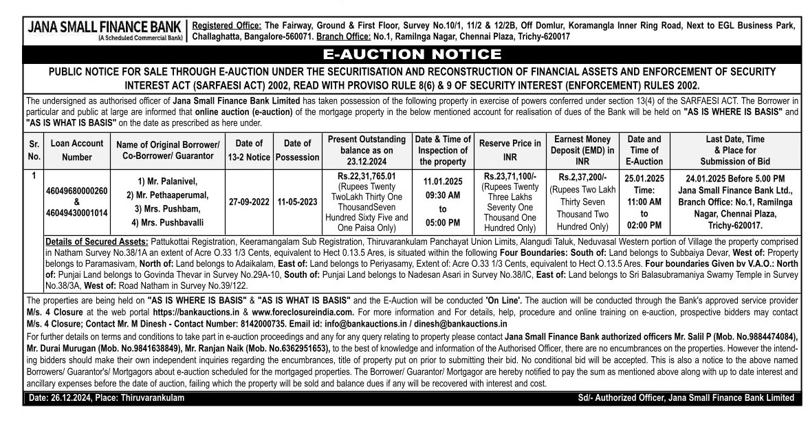 | Contact Details: | 8844Contact The Authorized Officer : Mr Salil P 9884474084/ Mr Durai Murugan/ Mr Ranjan Naik 6362951653 |