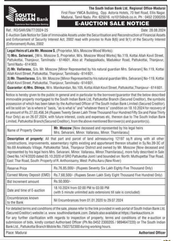 | Schedule of Property: | Description of property: All that part and parcel of land admeasuring 12197 sq.ft along with all other constructions, improvements, easementary rights existing and appurtenant thereon situated in Sy.No.39-3C of No.69 Anaikkadu Village, Pattukkottai Taluk, Thanjavur District and owned by Mr. Moscow [Now deceased and represented by his legal heirs Mrs. Selvarani, Minor. Vallarasu, Minor. Thamilarasu], more fully described in Sale Deed No. 1474/2020 dated 05.10.2020 of SRO Pattukottai Joint I and bounded on: North: Muthupettai Thar Road, East: Thar Road, South: Property of R. Anthonisamy, West: Puthu Aaru (New River) |