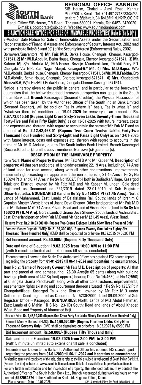 | Schedule of Property: | Item No.1: Name of Property Owner: Mr Faiz MD And Mr Kabeer M, Description of property: All that part and parcel of land admeasuring 22.19 Ares, including 0.74 Ares of land used for road access, along with all other constructions, improvements, easement rights existing and appurtenant thereon comprising 21.45 Ares in Re Sy No 1502/4 Pt 3 and 0.74 Ares in Re Sy No 1502/3 Pt 4 both in Badiadka Village, Kasargod Taluk and District owned by Mr Faiz M.D and Mr Kabeer M. under Sale deed registered as Document no 224/2019 dated 23.01.2019 of Sub Registrar Office-Badiadka. BOUNDARIES (land in Re Sy No 1502/4 Pt (21.45 Ares): North: Lands of Muhammed, East: Lands of Balakrishna Rai, South; lands of Ibrahim & Gopalan Master, West: lands of Jnana Deva Shenoy, Other land portion of Mr. Faiz M.D and Mr. Kabeer M (0.74 Ares), Private Road and land of Vishnu Bhat. (land in Re Sy No 1502/3 Pt (0.74 Are): North: Lands of Jnana Deva Shenoy, South; lands of Vishnu Bhat, East: Other land portion of Mr Faiz M.D and Mr Kabeer M (21.45 Ares), West: Road |