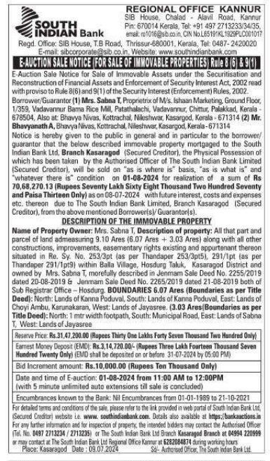 | Schedule of Property: | All that part and parcel of land admeasuring 9.10 Ares (6.07 Ares + 3.03 Ares) along with all other constructions, improvements, easementary rights existing and appurtenant thereon situated in Re. Sy. No. 253/3pt (as per Thandaper 253/3pt5), 291/1pt (as per Thandaper 291/1pt9) within Balla Village, Hosdurg Taluk, Kasaragod District and owned by Mrs. Sabna T, morefully described in Jenmam Sale Deed No. 2255/2019 dated 20-08-2019 & Jenmam Sale Deed No. 2265/2019 dated 21-08-2019 both of Sub Registrar Office - Hosdurg. BOUNDARIES 6.07 Ares (Boundaries as per Title Deed): North: Lands of Kanna Poduval, South: Lands of Kanna Poduval, East: Lands of Choyi Ambu, Karunakaran, West: Lands of Jayasree. (3.03 Ares (Boundaries as per Title Deed): North: 1 mtr width footpath, South: Municipal Road, East Lands of Sabna T. West: Lands of Jayasree |