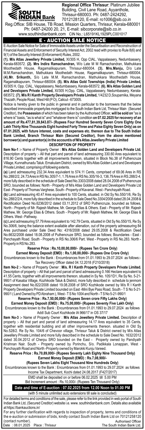 | Schedule of Property: | All that part and parcel of land admeasuring 14.17 Ares equivalent to 35 Cents. together with residential building and all other improvements thereon. situated in Old Sy No.528/2. Re Sy No. 104/6 of Chevoor village, Thrissur Taluk & District owned by M/s Atlas Jewellery Private Limited and more fully described in the schedule to Sale Deed No. 1632/2012 dated 30.04.2012 of Cherpu SRO bounded on the East - Property owned by Pandiyath Krishnan Nair. South Property owned by Porinchu, S/o. Padikkala Lonappan, West Panchayath Road and North-Property owned by Marokki Kunju Vareed. |