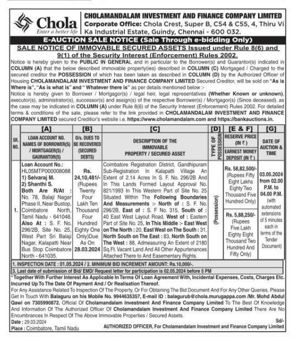 | Schedule of Property: | Coimbatore Registration District, Gandhipuram Sub-Registration In Kalapatti VillageAn Extent of 2.14 Acres in S. F. No. 296/28 And In This Lands Formed Layout Approval No. 821/1993 In This Western Part of Site No. 25 Situated Within The Following Boundaries And Measurements: North of S. F. No. 296/28, East of S. F No. 315, South of: 40 East West Layout Road, West of Eastern Part of Site No. 25. In This Middle East West on The North: 20. East West on The South: 31, North South on The East: 83. North South on The West: 88, Admeasuring An Extent of 2180 Sq. Ft. Vacant Land And All Other Appurtenances Attached There to And Easementary Rights. |