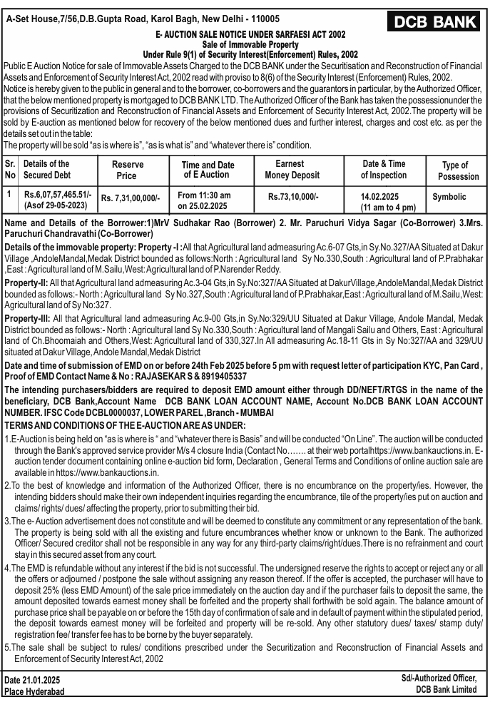 | Schedule of Property: | Details of the immovable property: Property :All that Agricultural land admeasuring Ac.6-07 Gts, in Sy. No. 327/AA Situated at Dakur Village AndoleMandal,Medak District bounded as follows North Agricultural land Sy South Agricultural land of P.Prabhakar East: Agricultural land of M.Sailu. West: Agricultural land of P.Narender Reddy.Property-II: All that Agricultural land admeasuring Ac. 3-04 Gts in Sy. 327/AA Situated at DakurVillage,AndoleMandal,M District bounded as follows:- North Agricultural land Sy No 327 South Agricultural land of Prabhakar, East: Agricultural land of M.Sailu, West:Agricultural land of Sy No:327.Property-III: All that Agricultural land admeasuring Ac.9-00 Gts, in Sy.No:329/UU Situated at Dakur Village, Andole Mandal, Medak District bounded as follows:- North Agricultural land Sy No 330, South Agricultural land of Mangali Sailu and Others, East Agricultural land of Ch. Bhoomajah and Others, West: Agricultural land of 330,327 In All admeasuring Ac. 18-11 Gts in Sy No:327/AA and 329/UU situated at Dakur Village, Andole Mandal Medak District |