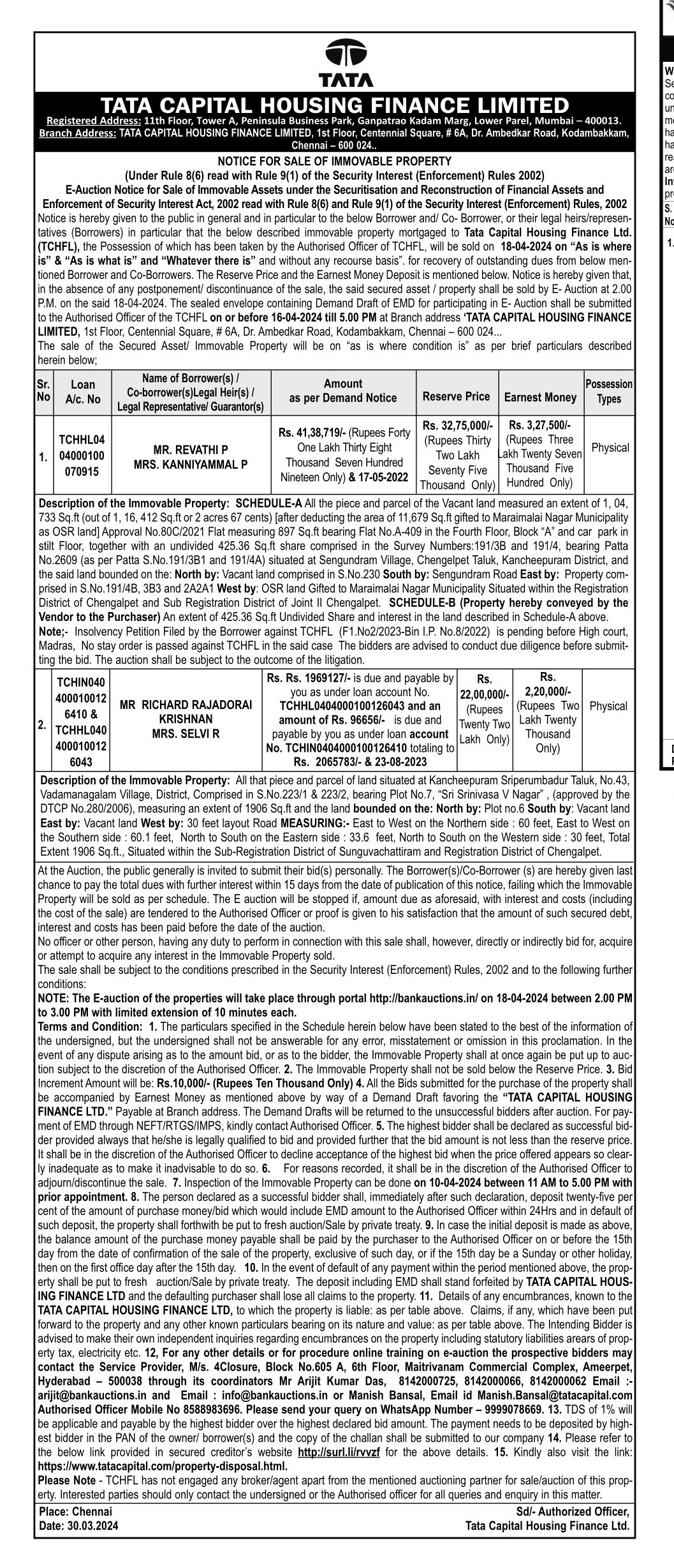 | Schedule of Property: | Description of the Immovable Property: All that piece and parcel of land situated at Kancheepuram Sriperumbadur Taluk, No.43, Vadamanagalam Village, District, Comprised in S.No.223/1 & 223/2, bearing Plot No.7, "Sri Srinivasa V Nagar", (approved by the DTCP No.280/2006), measuring an extent of 1906 Sq.ft and the land bounded on the: North by: Plot no.6 South by: Vacant land East by: Vacant land West by: 30 feet layout Road MEASURING:- East to West on the Northern side: 60 feet, East to West on the Southern side: 60.1 feet, North to South on the Eastern side: 33.6 feet, North to South on the Western side: 30 feet, Total Extent 1906 Sq.ft., Situated within the Sub-Registration District of Sunguvachattiram and Registration District of Chengalpet |