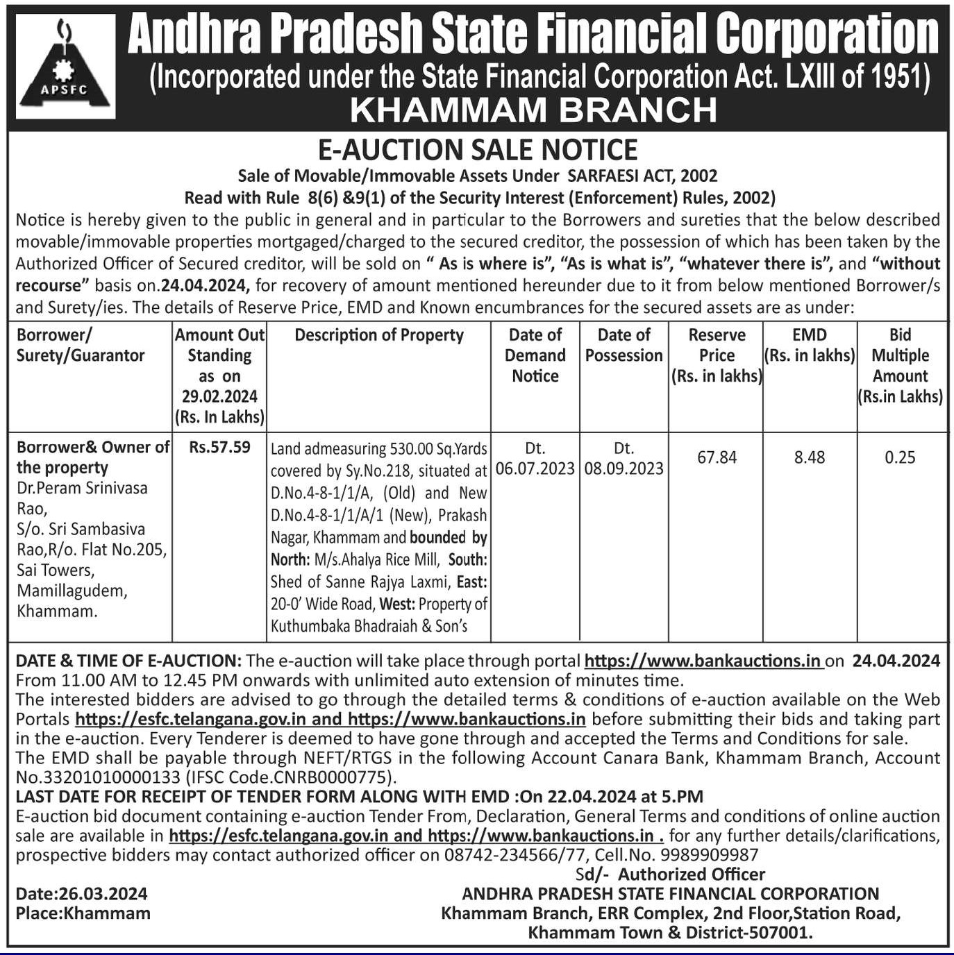 | Schedule of Property: | Land admeasuring 530.00 Sq.Yards covered by Sy.No. 218, situated at D.No. 4-8-1/1/A, (Old) and New D.No. 4-8-1/1/A/1 (New), Prakash Nagar, Khammam and bounded by North: M/s. Ahalya Rice Mill, South: Shed of Sanne Rajya Laxmi, East: 20-0' Wide Road, West: Property of Kuthumbaka Bhadraiah & Son's. |