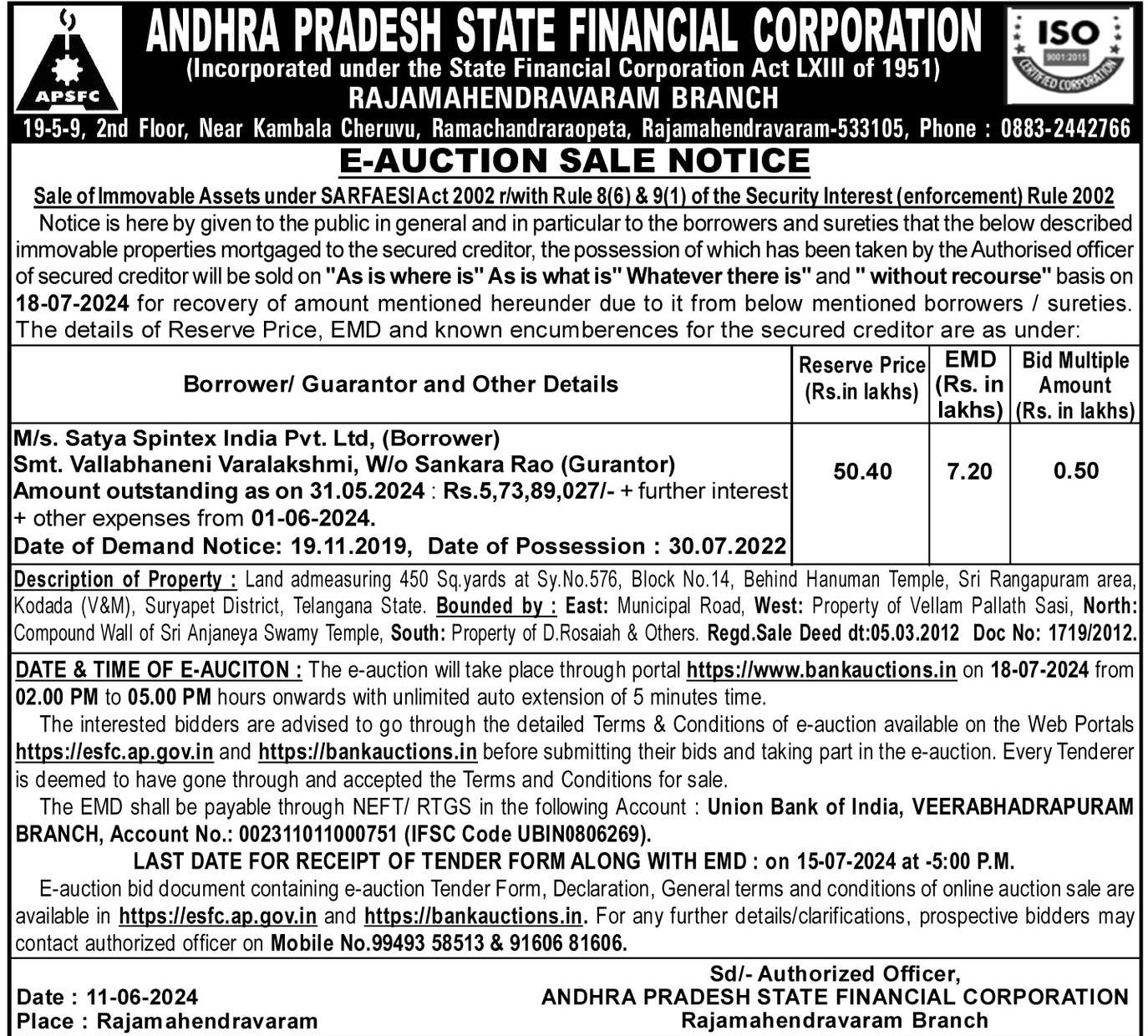 | Inspection Details: | For property inspection: Contact The Authorized Officer: Ph No: 99493 58513, 91606 81606 |