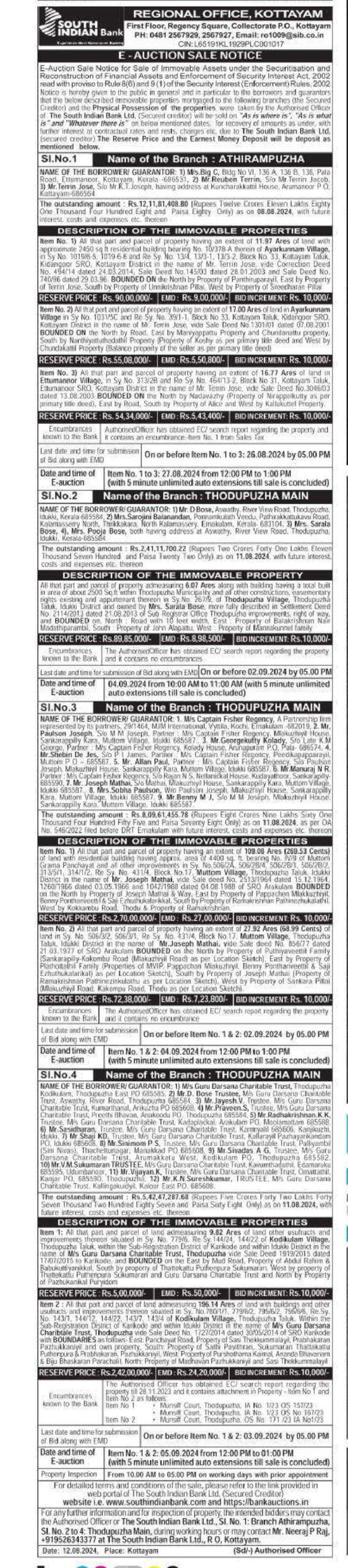 | Contact Details: | Contact The Authorized Officer: 9526343377 PH: 0481 2567929, 2567927 , Email:ro1009@sib.co.in |