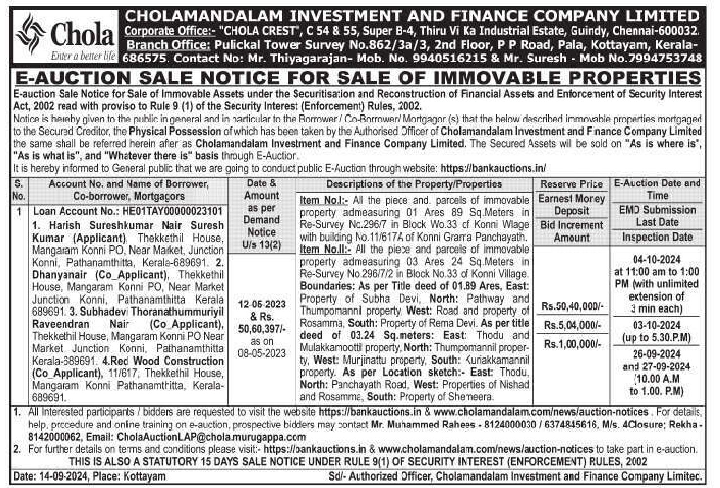 | Contact Details: | Contact The Authorized Officer : Mr. Muhammed Rahees - 8124000030 /6374845616; Rekha -8142000062 Mr. Thiyagarajan- Mob. No. 9940516215 & Mr. Suresh - Mob No.7994753748 |