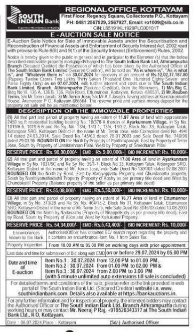| Contact Details: | Contact The Authorized Officer Phno : Mr Neeraj P Raj 9526343377 / 0481-2567929-2567927 Email:ro1009@sib.co.in |