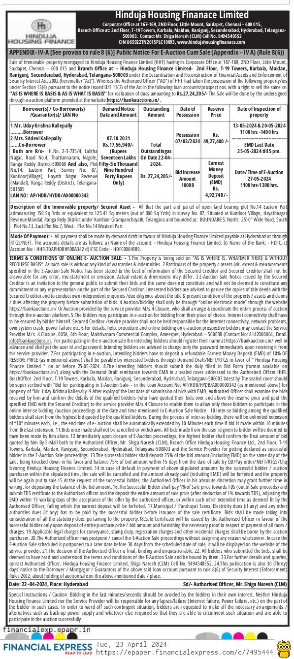 | Schedule of Property: | Description of the Immovable property / Secured Asset - All that the part and parcel of open land bearing plot No.14 Eastern Part admeasuring 150 Sq Yrds or equivalent to 125.41 Sq meters (out of 300 Sq Yrds) in survey No. 87, Situated at Kuntloor Village, Hayathnagar Revenue Mandal, Ranga Reddy District under Kuntloor Grampanchayath, Telangana and bounded as: BOUNDARIES: North: 25 -0 Wide Road, South Plot East: Plot No.7 West: Plot No. Western Part |